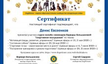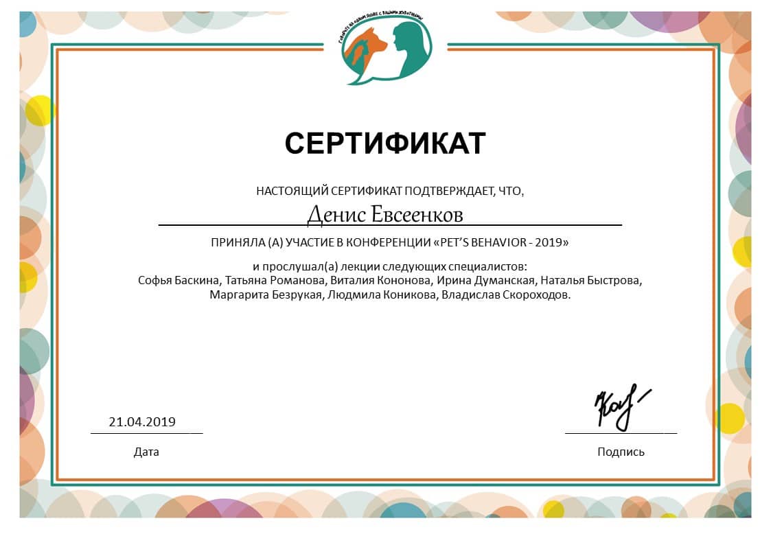 ЕВСЕЕНКОВ Денис /Кинолог, Зоопсихолог, Санкт-Петербург/ _____ Провожу индивидуальные консультации и тренировки: • Начальный курс послушания: основные команды, хождение на поводке, выдержка. • Социализация щенка: первые дни в доме, приучение к туалету, приучение к процедурам, приучение оставаться дома одному, приучение к амуниции, развивающие игры, как избежать укусов, алгоритм знакомства щенка с окружающими раздражителями (улица, люди, собаки и др.), неподбор на улице и многое другое. • Коррекция проблемного поведения: нечистоплотное поведение, чрезмерный лай, боязнь улицы, тревожность, фобии, боязнь одиночества, гиперактивность, погромы в квартире, агрессия к собакам, агрессия к людям, проблемы охраны ресурсов Мое отношение к собакам. Выбор моего образования был продиктован любовью к животным. Собаки занимают в моей жизни очень важную роль. Я считаю их уникальными творениями природы, которые живут рядом с нами уже много тысяч лет. Несмотря на это тесное и долгое сотрудничество, владельцы собак постоянно сталкиваются с ситуациями, которые заставляют их пересматривать свои взаимоотношения с питомцами. Часто люди выбирают очень некорректные, болезненные и неэффективные методы коррекции поведения, что только ухудшает взаимопонимание между собакой и владельцем. Моя цель – помочь понять собаку, найти оптимальные и эффективные алгоритмы решения проблемы. При этом ключевым моментом в отношениях между человеком и собакой должна быть не «война», а взаимовыручка и партнерство!